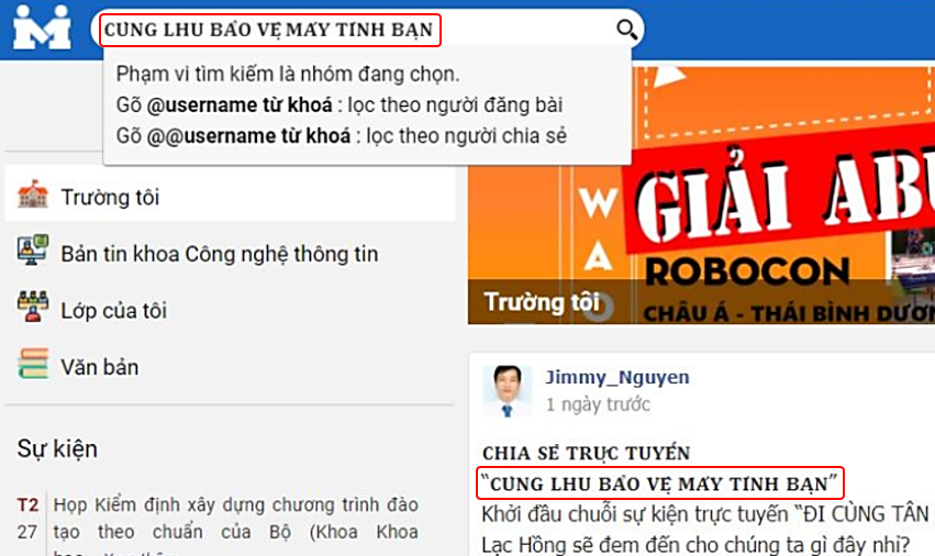 **+ Tìm kiếm theo nội dung:** Tại ô tìm kiếm nhập nội dung muốn tìm. <mark style="color:red;">**Ví dụ:**</mark> nhập nội dung "CÙNG LHU BẢO VỆ MÁY TÍNH CỦA BẠN"