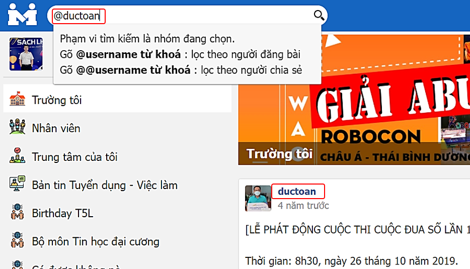 **+ Tìm kiếm theo người đăng bài:** Tại ô tìm kiếm nhập tên người đăng bài theo cú pháp <mark style="color:blue;"><@username></mark> <mark style="color:red;">**Ví dụ:**</mark> @ductoan