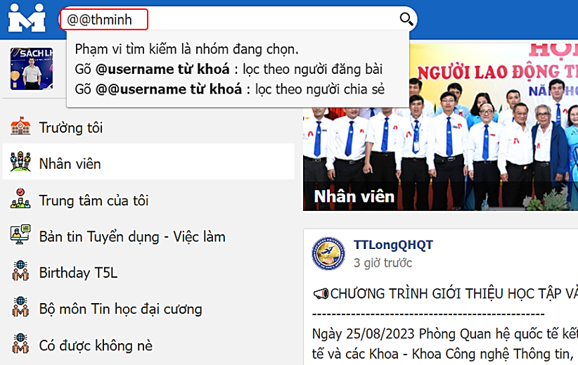 **+ Tìm kiếm theo người chia sẻ:** Tại ô tìm kiếm nhập tên người chia sẻ theo cú pháp <mark style="color:blue;"><@@username></mark> <mark style="color:red;">**Ví dụ:**</mark> @@thminh